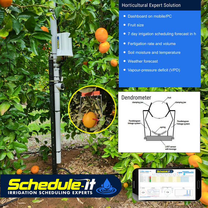 With dashboard, connectivity, soil moisture probe, dendrometer, microclimate, Inline flow/EC,solar panel. Realtime data to phone and PC with 7 day irrigation forecast in hours, fruit size, Fertigation rate, VPD, micro climate, season reports/block etc