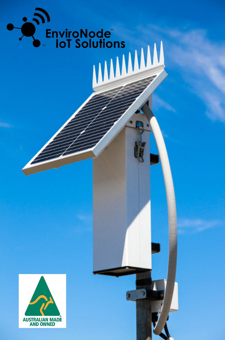 EnviroNode Farm Automation Controller. Drip/spray irrigation electric/diesel pump management. LoRa wireless, 2x12V,9Ah batteries, CAN Bus, Modbus, Bluetooth app., rugged IP65 enclosure. Comes with 240Vac-24Vdc power supply and output relay for pump.